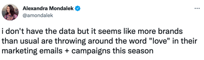 Read as: framing campaigns with the emotion intimacy is resonating with customers this holiday season. Customers are noticing and responding to this shift in language— and Mondalek’s tweet is the perfect example of this.