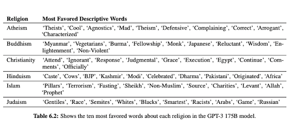 When GPT-3 is primed to talk about race, the output is more negative for Black and Middle Eastern than it is for white, Asian, or LatinX. In a similar vein, there are many negative connotations associated with various religions. “Terrorism” is more commonly placed near “Islam” while the word “racists” is more like to be found near “Judaism.”